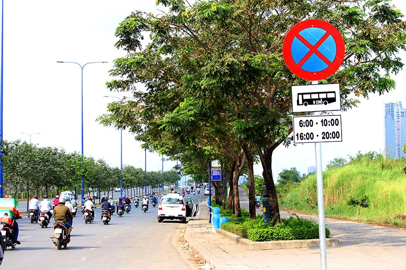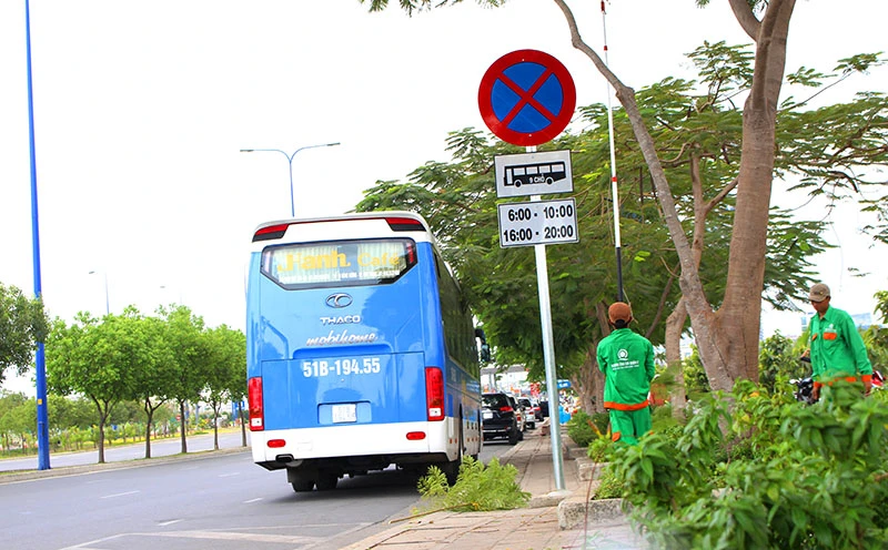 Sở GTVT TP.HCM đã cho lắp đặt biển cấm dừng, đậu đối với xe khách từ chín chỗ trở lên theo hai khung giờ khiến tình trạng vi phạm giảm hẳn. Ảnh: LÊ THOA
