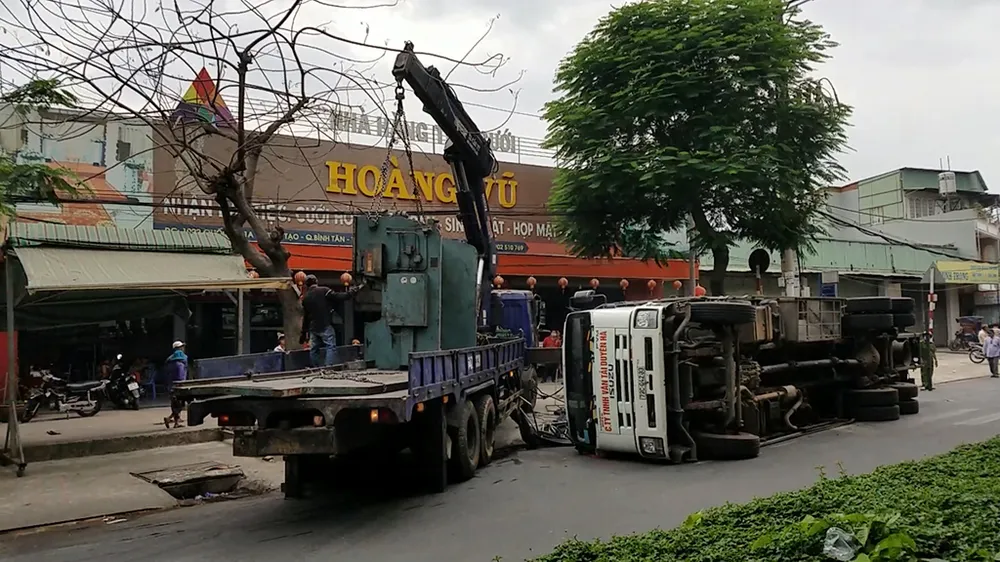 Khi đến khu vực quay đầu dưới chân cầu Tỉnh lộ 10 (quận Bình Tân, TP.HCM), tài xế cho xe chuyển hướng để di chuyển ngược về lại hướng vòng xoay An Lạc thì máy dập trên xe đứt xích chằng, nghiêng về một bên.