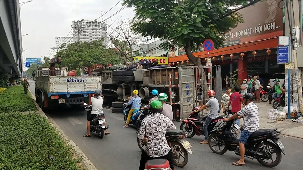 Sự cố khiến chiếc xe mất thăng bằng, lật ngang trước sảnh một nhà hàng tiệc cưới. May mắn, nhiều phương tiện xe máy lưu thông trên đường đã kịp thời phát hiện, tránh kịp.
