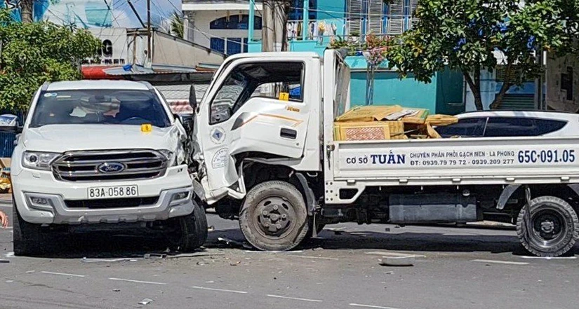 Do bị tông bất ngờ, xe ô tô tải mất lái lao sang làn đường bên cạnh, tông trúng xe ô tô BKS 83A-058.86 lưu thông ngược chiều.