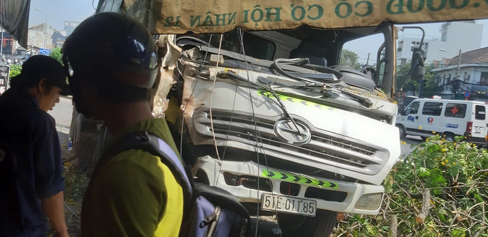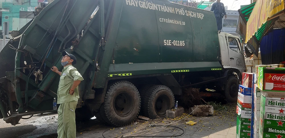Tại hiện trường, đầu xe rác hư hỏng nặng, một cây xanh bị tông gãy. Chiếc xe nắm sát thềm nhà một hộ dân. Vụ tai nạn không gây thương vong về người.