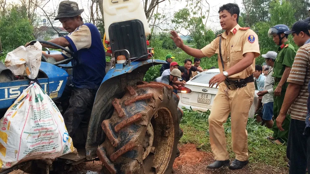 Do chiếc ô tô mắc kẹt dưới kênh nên người dân đã sử dụng một chiếc máy cày để hỗ trợ kéo lên đường, xe hư hỏng nhẹ. Phương tiện sau đó được đưa về hiện trường gây tai nạn để phục vụ công tác khám nghiệm hiện trường, điều tra, xử lý.
