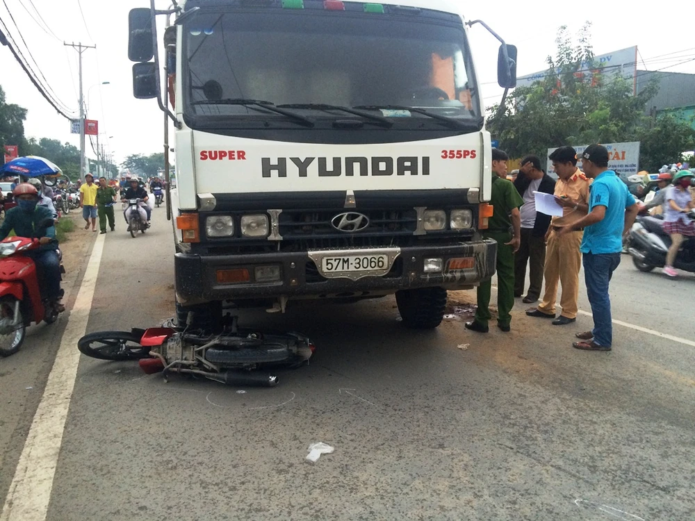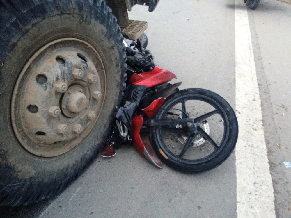 Chiếc xe máy của nạn nhân văng vào bánh trước xe tải chở cát, bị cán nát.