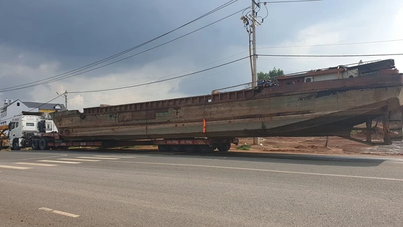 Chở thuyền "khủng" làm ách tắc giao thông, chủ xe và người điều khiển xe đầu kéo bị phạt gần 90 triệu đồng. Ảnh: KHÁNH TRƯỜNG