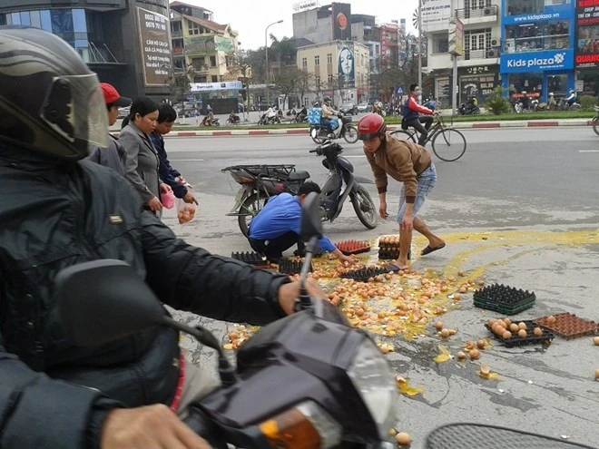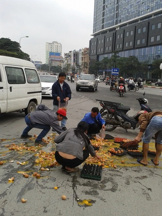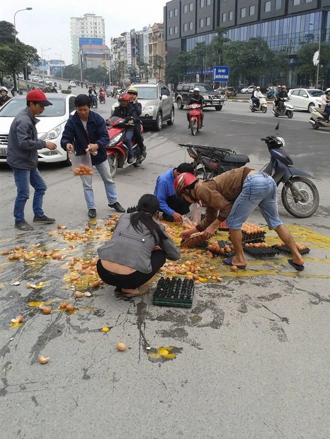 "Ngay sau khi xe bị tai nạn, một số người dân đã dừng xe giúp người bị nạn dựng xe lên và nhặt số trứng còn nguyên vẹn để vào khay, cũng có người dùng túi nilon nhặt hàng chục quả và đem về mà không thấy trả tiền cho chủ xe. Trong khi đó, lái xe máy chở trứng mặt nhăn nhó kêu đau nhưng vẫn cố gắng nhặt những quả trứng không bị vỡ bỏ vào khay" - chị Anh cho biết.
