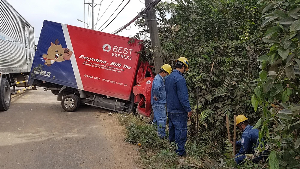 Chiếc xe chuyển phát nhanh tông trúng cột điện sau khi nổ lốp. Ảnh HT