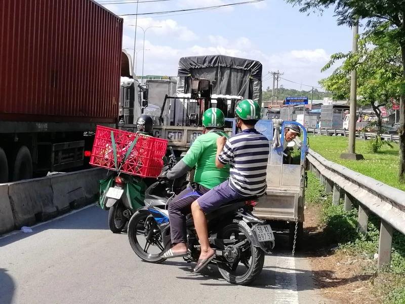 Đây là cảnh xe máy vượt qua dòng xe tải, container trên cầu vượt Trạm 2.