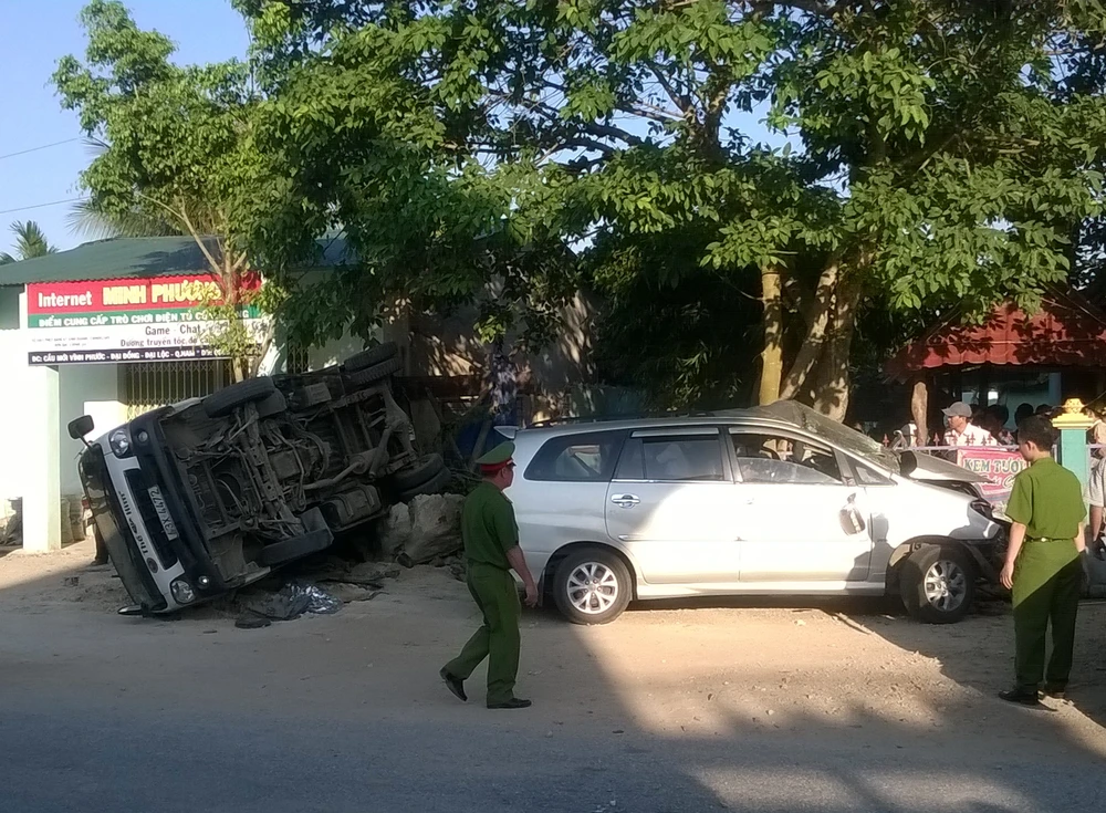 Cú đâm quá mạnh khiến cả hai chiếc xe bị đẩy văng ra xa, xe Innova bị nghiêng hẳn về một bên, bẹp dúm phần đầu xe còn chiếc xe tải bị lật ngửa.