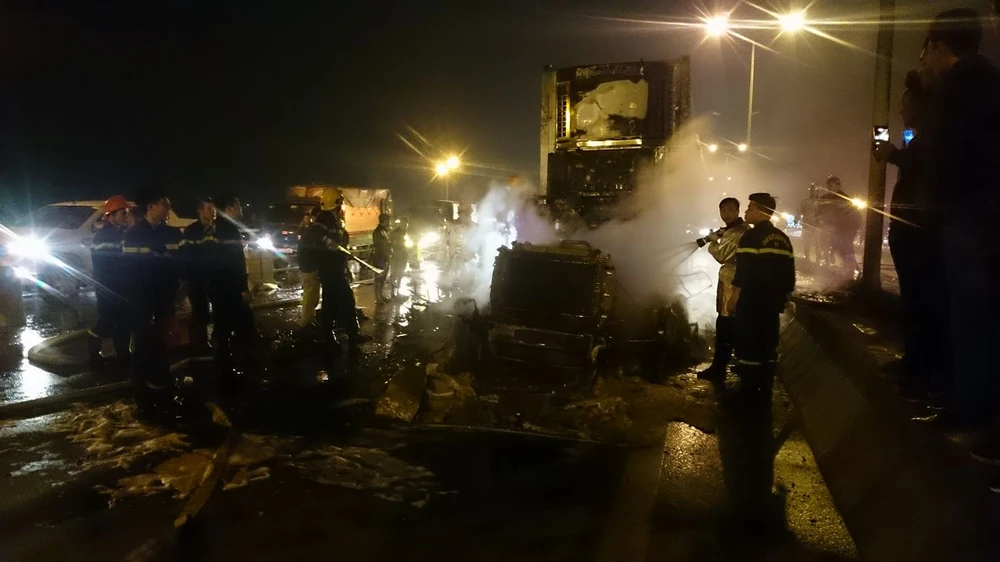 (PLO)- Chiếc xe container bốc cháy dữ dội trên cầu Thanh Trì (Hà Nội) hồi 19 giờ 15 phút tối nay (6-2) khiến nhiều người hoảng loạn.