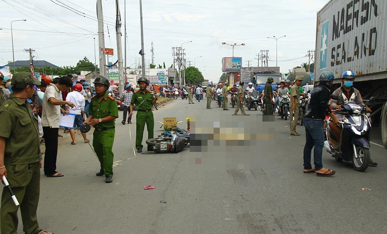 Tại hiện trường, xe container dừng cách hiện trường khoảng 200 m, thi thể nạn nhân nằm bên cạnh xe máy. Mũ bảo hiểm và dép của các nạn nhân rơi ra đường. Nguyên nhân đang được lực lượng chức năng điều tra làm rõ.