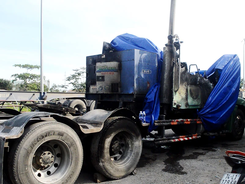Đầu xe container bị cháy rụi sau sự cố. Ảnh: NGUYỄN TÂN