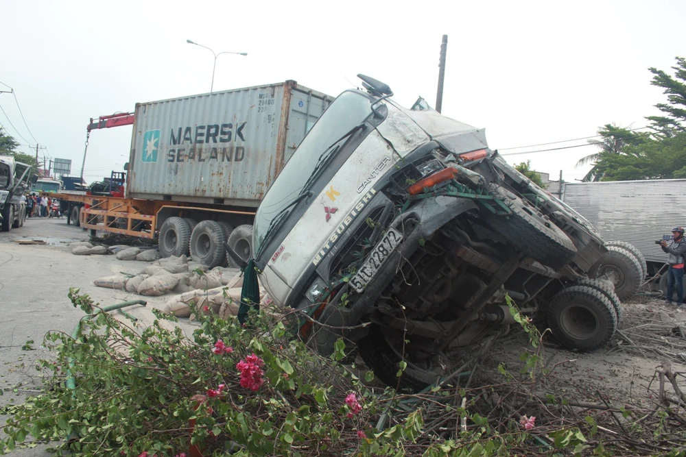 Chiếc xe tải bị container húc lật nhào chắn ngang đường