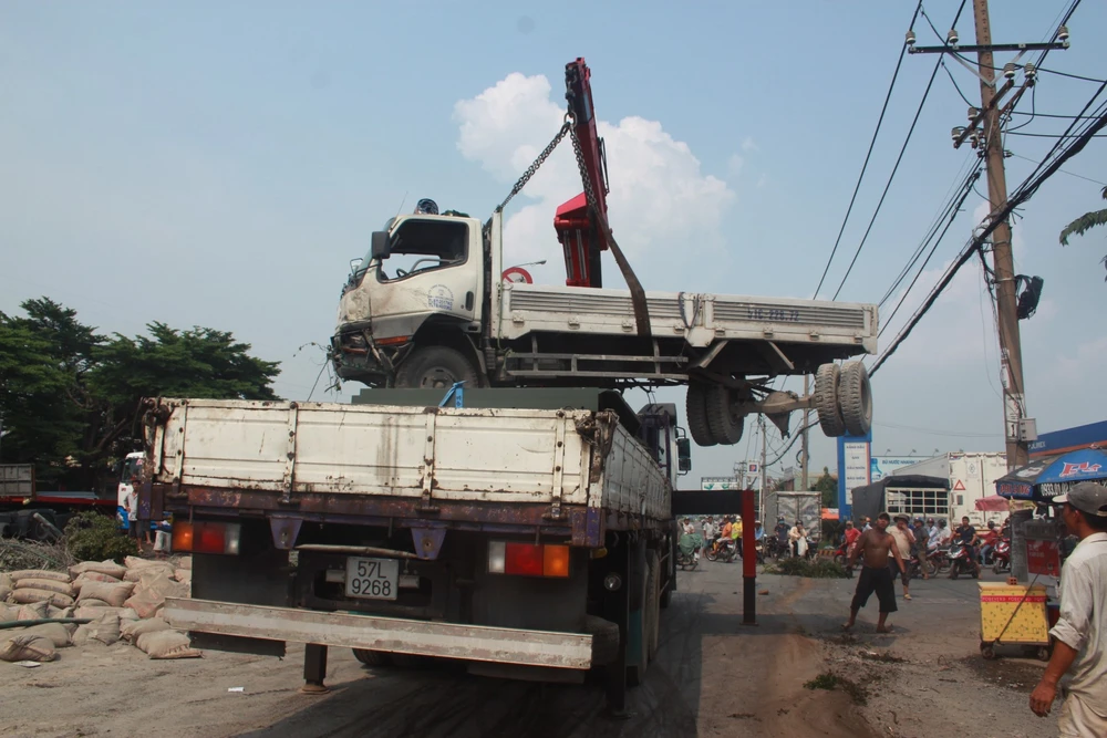 Khi vừa đổ dốc cầu Bình Phước được một đoạn thì xe container mất lái húc văng hàng rào sắt bên quốc lộ rồi húc lật một chiếc xe tải BKS 51C-228.72 chở đầy xi măng đang lưu thông theo hướng ngược lại.