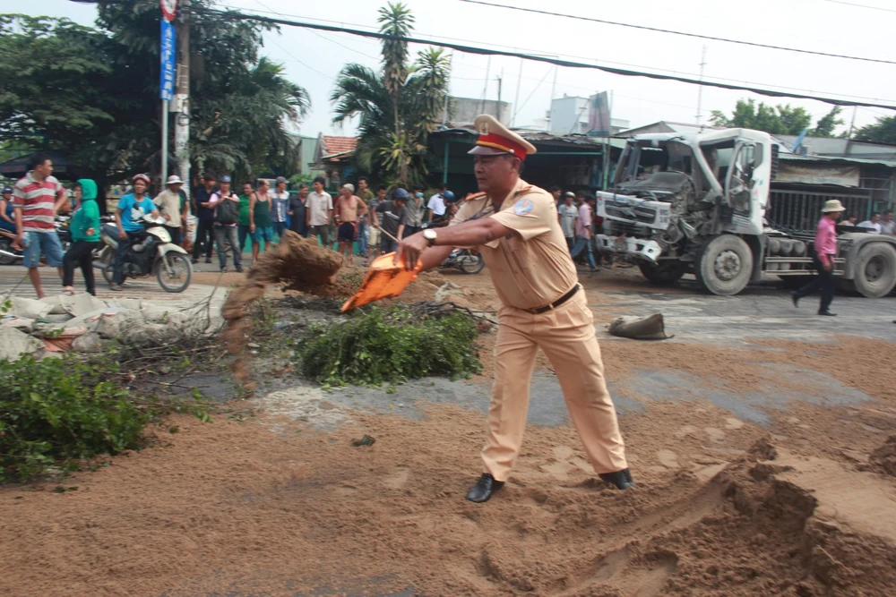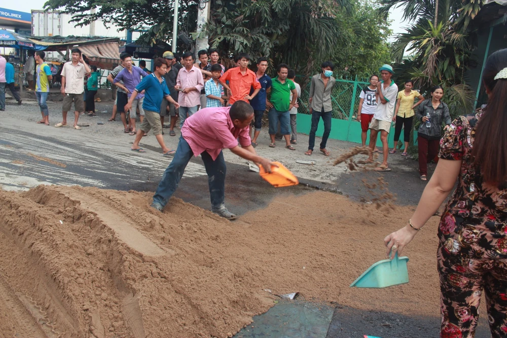 Người dân và CSGT lấy cát lấp lên bề mặt đường có dầu nhớt loang