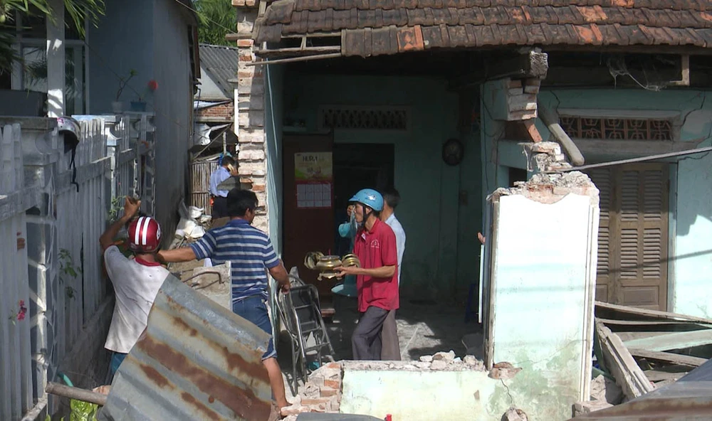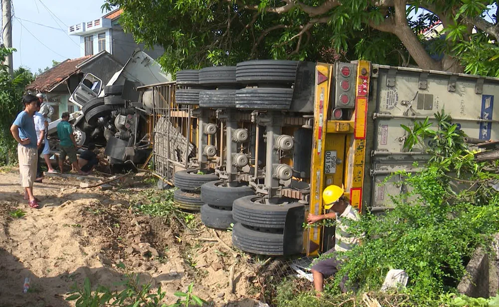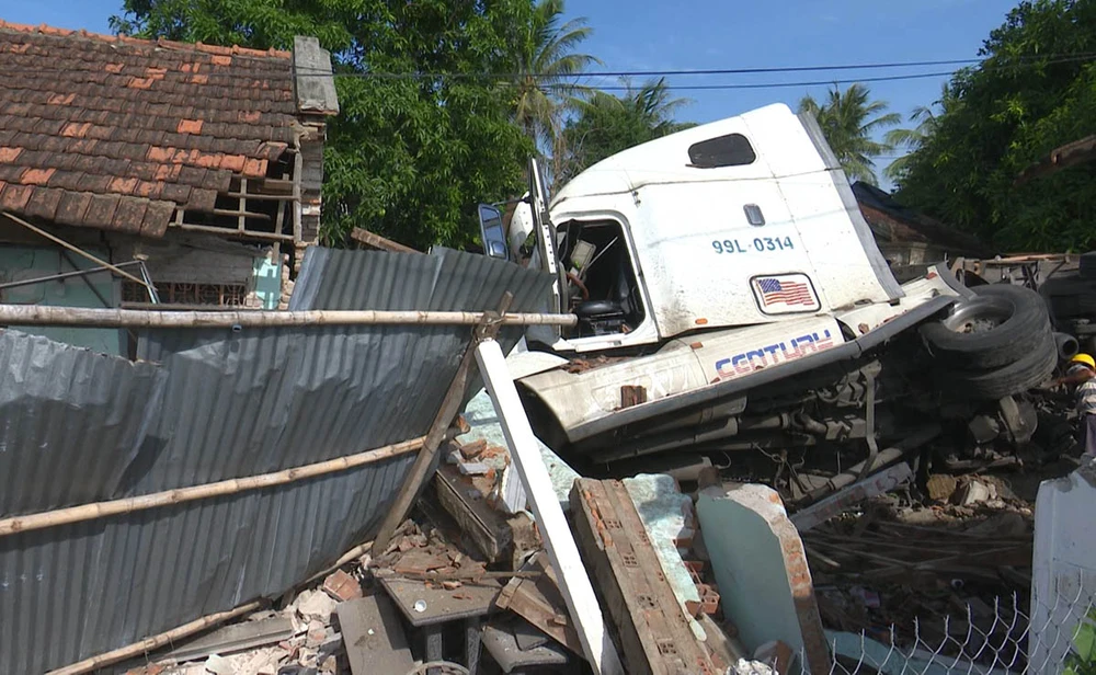 Ghi nhận tại hiện trường cho thấy phần trước căn nhà chính của ông Vũ bị sập, hư hỏng nặng, một căn nhà phụ bị sập hoàn toàn. Xe container bị lật nghiêng ngay bên trong căn nhà.