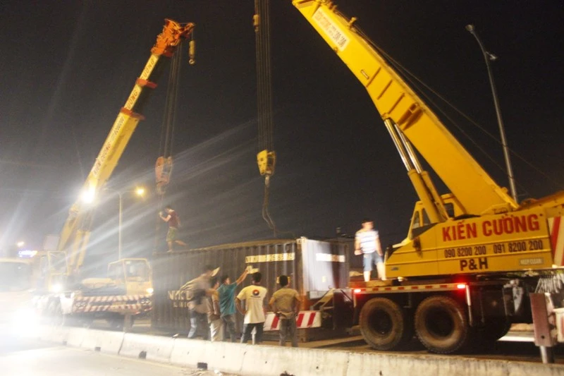 Chiếc xe container lật ngang khi đang lưu thông qua cầu vượt Bình Phước, tối 27-4.