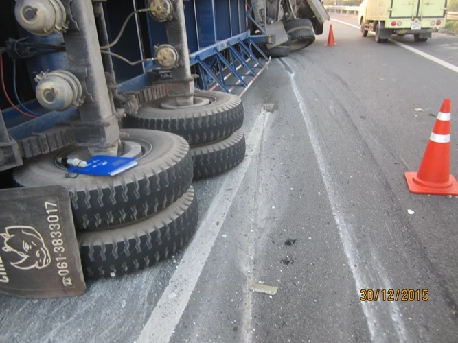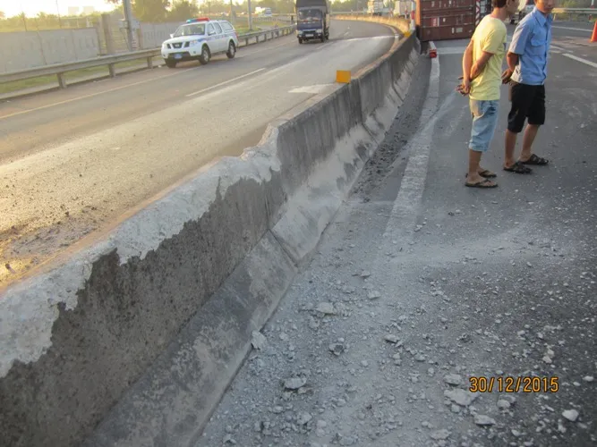 Thời điểm trên anh Nguyễn Văn Hoàng điều khiển xe container biển số 51C-201.87 kéo theo rơmóoc 51R-103.11 của Công ty TNHH DV VT Nam Khang, lưu thông từ TP.HCM về Trung Lương. Khi đến Km0+500 do mất lái, chiếc xe đâm vào dải phân cách bê tông làm xe lật nghiêng hoàn toàn. Rất may tài xế không bị thương tích nhưng vụ việc gây thiệt hại cho cầu đường: Dải phân cách bị vỡ, trụ biển báo bị rơi, nhớt trong xe chảy lênh láng ra mặt đường. CSGT huyện Châu Thành đã kịp thời ra xử lý vụ việc.