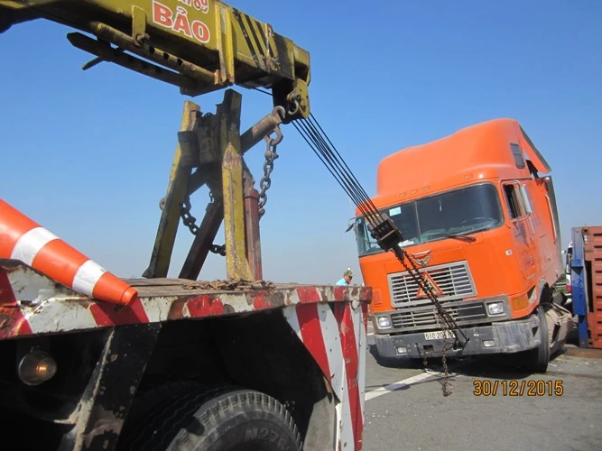 Phải đến 12 giờ trưa 30-12 lực lượng chức năng mới điều được xe cẩu tải trọng lớn đến để cầu container lên, đồng thời điều một chiếc đầu kéo khác ra để kéo container về. Thời điểm xảy ra sự cố giao thông trên đường cao tốc ùn tắc kéo dài mấy km.