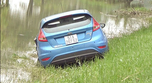 Cú tông đã khiến văng xe ô tô bốn chỗ xoay ngang, tiếp tục bị xe container đẩy trượt dài khoảng 60 m và hất xuống mương nước ven đường.