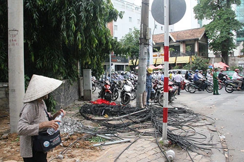 Tại hiện trường, cột điện bị nghiêng, nhân viên điện lực phải sử dụng kìm cắt sắt để cắt dây cáp. Giao thông ùn ứ nghiêm trọng trên đường Nam Kỳ Khởi Nghĩa và Nguyễn Thị Minh Khai.