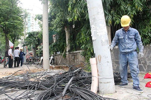 Các nhân viên điện lực phải cắt cáp viễn thông để giải phóng hiện trường. Ảnh: NGUYỄN TÂN