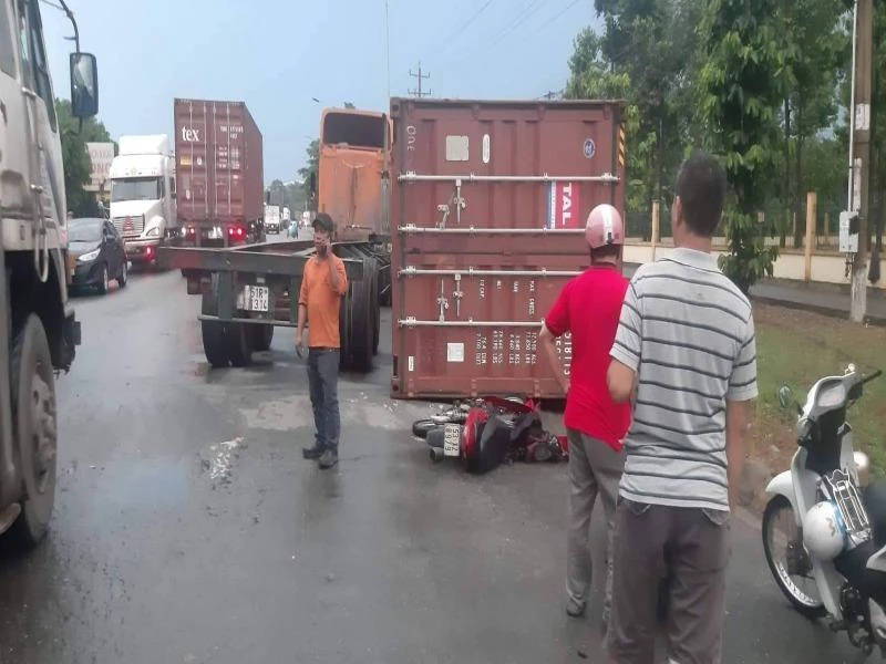 Đến nhà khách Quân đoàn 4 thuộc thị xã Dĩ An, xe container vừa di chuyển qua gờ giảm tốc thì bất ngờ bị ngã thùng container xuống đường. Ngay lúc này, một phụ nữ 40 tuổi, chạy xe máy biển số 53X2-8979 đi gần đó không may bị thùng container đè ngã trúng vào người.