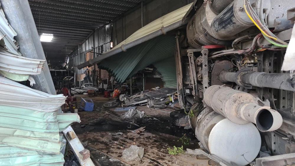 Cửa hàng bán sắt thép hư hỏng một phần. Ảnh: CÔNG NGUYÊN