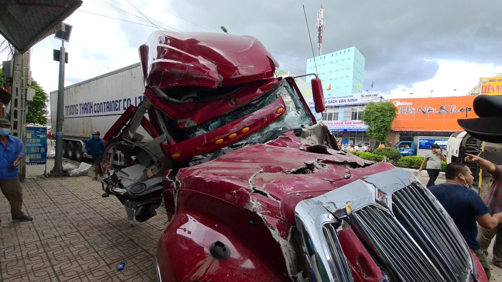 Tại hiện trường, phần đầu xe container 51D-612.3 đâm vào cửa hàng bán sắt thép, sơ-mi rơ-móoc của xe này lật, nằm chắn ngang quốc lộ 1. Đầu xe container 76C -095.12 hư hỏng nặng.