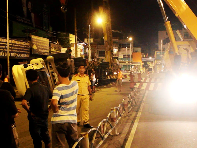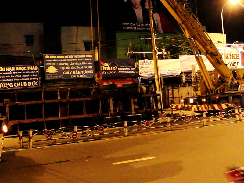 Khi đến giao lộ với đường Bạch Đằng (phường 24, quận Bình Thạnh) tài xế cho xe ôm cua để rẽ vào đường này. Tuy nhiên, do khúc cua ngoặt và thùng container nặng nên xe mất kiểm soát, lật ngang.