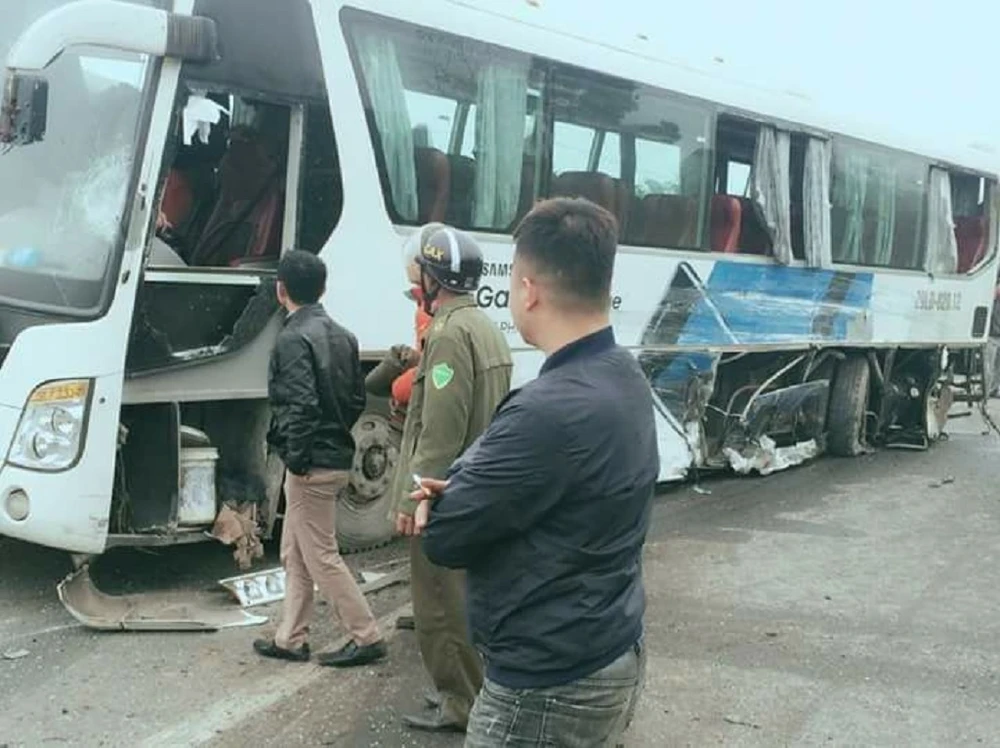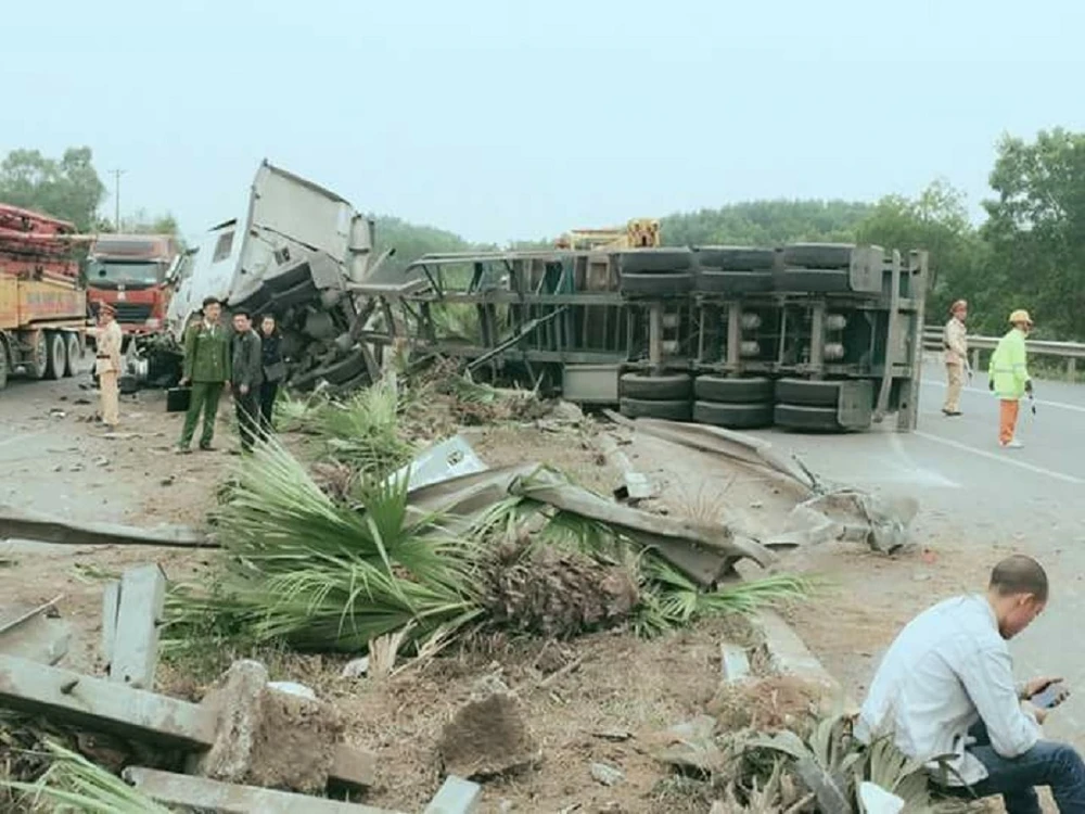 Vụ va chạm khiến năm người bị thương phải vào bệnh viện cấp cứu. Tại hiện trường, xe 29LD-020.12 bị hư hỏng ở phần hông. Xe container bị gãy trục, cày nát dải phân cách và cây cối giữa đường,…