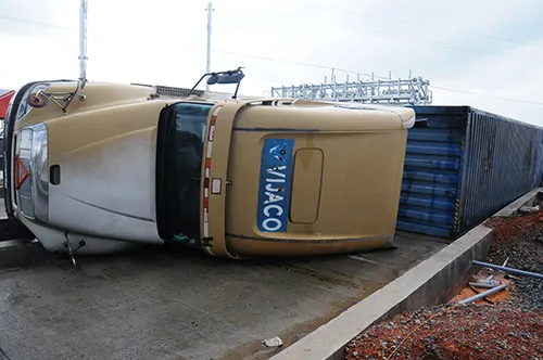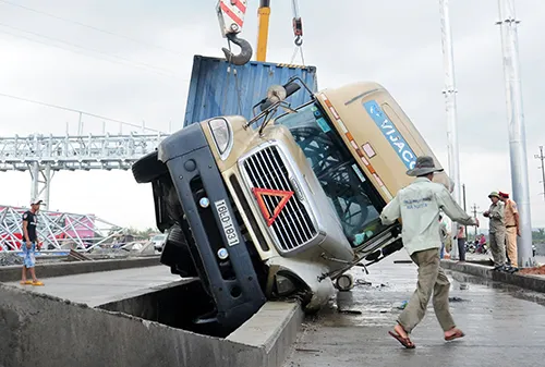 Tài xế tài xế Phạm Ngọc Văn (56 tuổi, ngụ TP Hải Phòng) thuật lại: Do tránh làn đường mới thảm nhựa thì rẽ trái đi vào làn đường ở giữa trạm thu phí, xe container vấp vào dải phân cách rồi trượt dài, lật nghiêng xuống đường. “Xe đang trên đường chở 13 tấn bánh ra Hà Nội mà giờ nước mưa ngập ở dải phân cách ồ ạt tràn vào thùng container chắc là hỏng hết rồi” - lái xe Văn lo lắng.