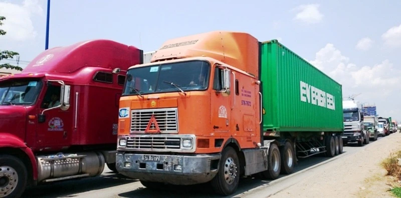 Từng đoàn xe container nối đuôi nhau xếp hàng dài