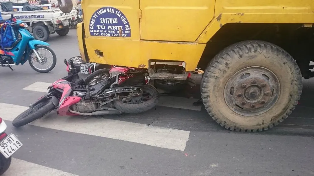 Chiếc xe cẩu tông lùa 3 xe máy vào gầm khiến một bé trai 6 tuổi tử vong tại chỗ và nhiều người khác bị thương nặng phải đưa đi cấp cứu.