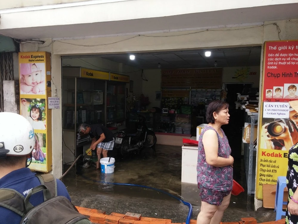 Gần đó, trong nhiều tuyến đường nhỏ, con hẻm rất nhiều nhà dân bị nước tràn vào, thức trắng đêm để tát nước.
