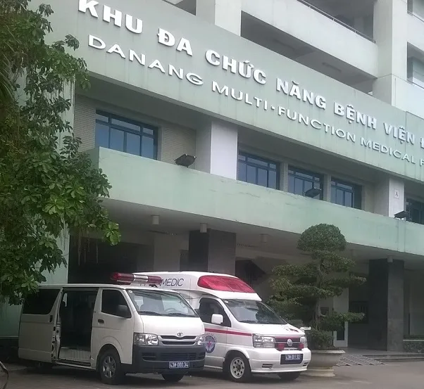 Hai chiếc xe cứu thương đang chờ sẵn trước sân bệnh viện Đà Nẵng