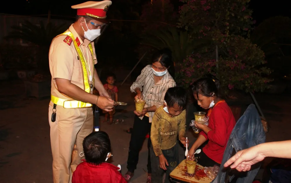 CSGT trực chốt và Câu lạc bộ kiến trúc sư trẻ Nghệ An, nhà thiện nguyện phát cháo cho những người mẹ và con.