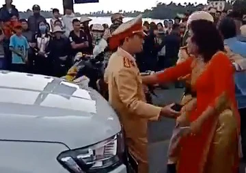 Lực lượng CSGT đã yêu cầu dừng xe tại khu vực cầu Đen tại khu vực thị trấn Núi Đối để xử lý thì một người phụ nữ là mẹ của chú rể đã xuống xe to tiếng ngăn cản.