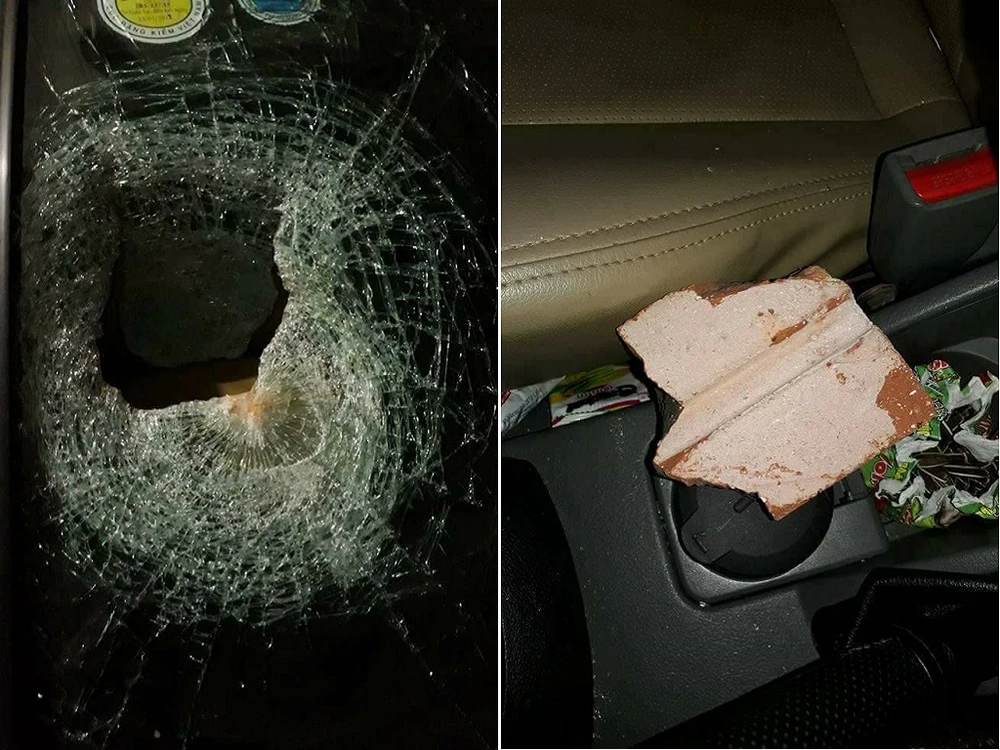 “Lúc đó tôi đang chạy với tốc độ khoảng 80 km/giờ thì bất ngờ nghe tiếng động lớn vang lên. Tôi giật mình phanh xe lại thấy nửa viên gạch xuyên thủng kính chắn gió, văng sang bên ghế phụ. Vợ tôi vô cùng hoảng sợ, không rõ chuyện gì vừa xảy ra” - anh N. kể lại.
