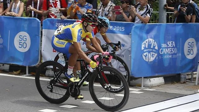 Cua rơ Nguyễn Thị Thật của Việt Nam (phía trong, áo đỏ) giành được HCV vì Jutatip (áo vàng) chơi tiểu xảo ép đối phương (vi phạm luật) .
