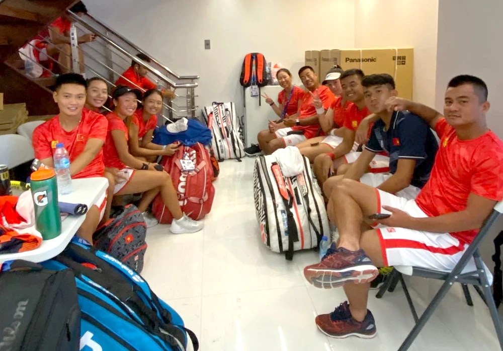 Đội tuyển quần vợt Việt Nam rời sân thi đấu vào trong nhà tránh, trú bão. ẢNH: MQ