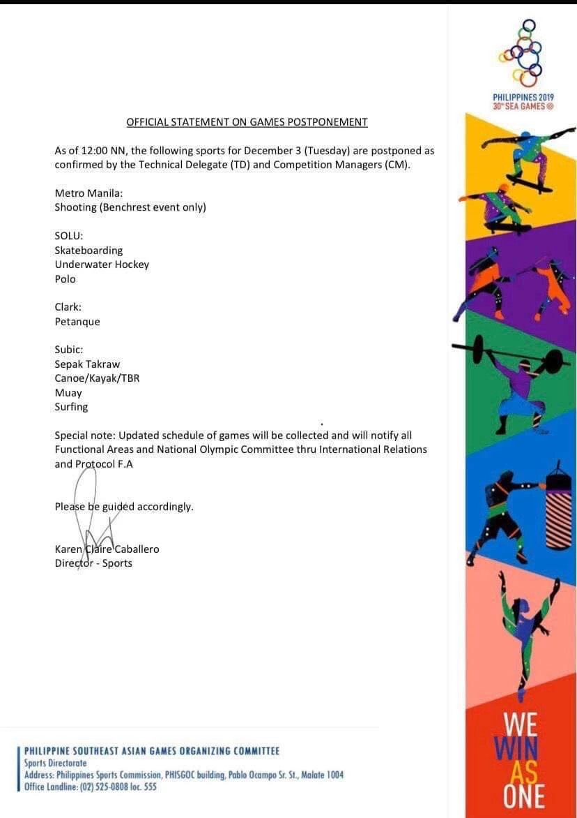 Lúc 12 giờ trưa nay (giờ địa phương), BTC SEA Games 30 cũng phát đi thông báo hoãn, hủy các buổi tập luyện và thi đấu tại các địa điểm. Tại Manila có môn bắn súng ảnh hưởng kế hoạch, trong khi tại địa điểm thi đấu Clark có các VĐV Việt Nam tranh tài môn bi sắt.