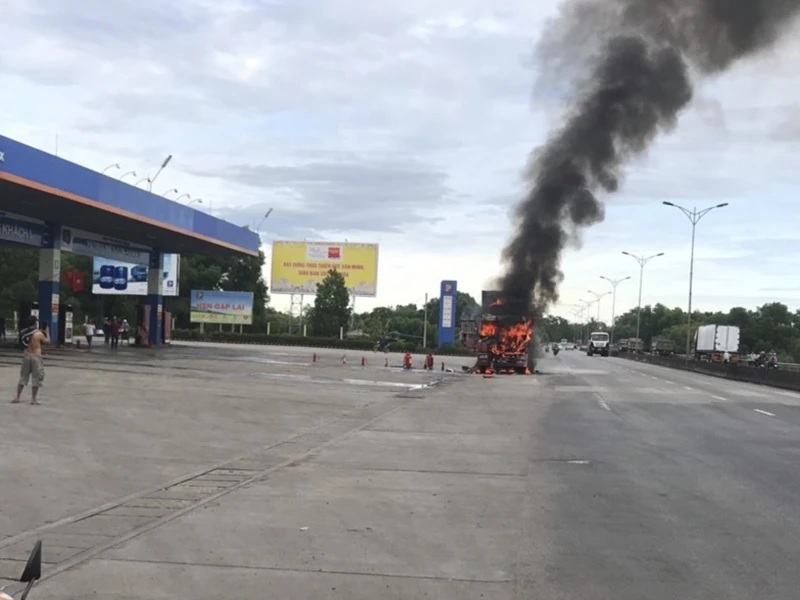 Ngay lúc này, tài xế cùng nhân viên cây xăng dùng bình cứu hỏa dập lửa nhưng không thành. Không lâu sau đó, đám cháy lan rộng toàn thân xe, khói bốc cao khiến nhiều người tham gia giao thông trên tuyến QL1A phải dừng phương tiện, tránh xa đám cháy vì sợ chiếc xe phát nổ.