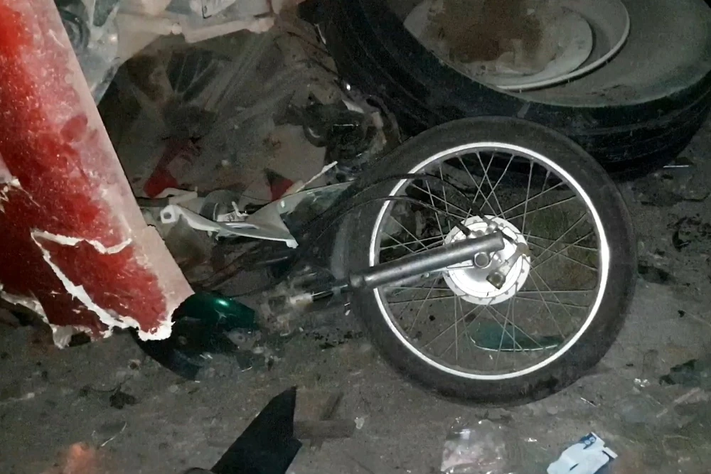 Chiếc xe máy cùng người điều khiển bị xe đầu kéo đè bẹp. Ảnh: KD