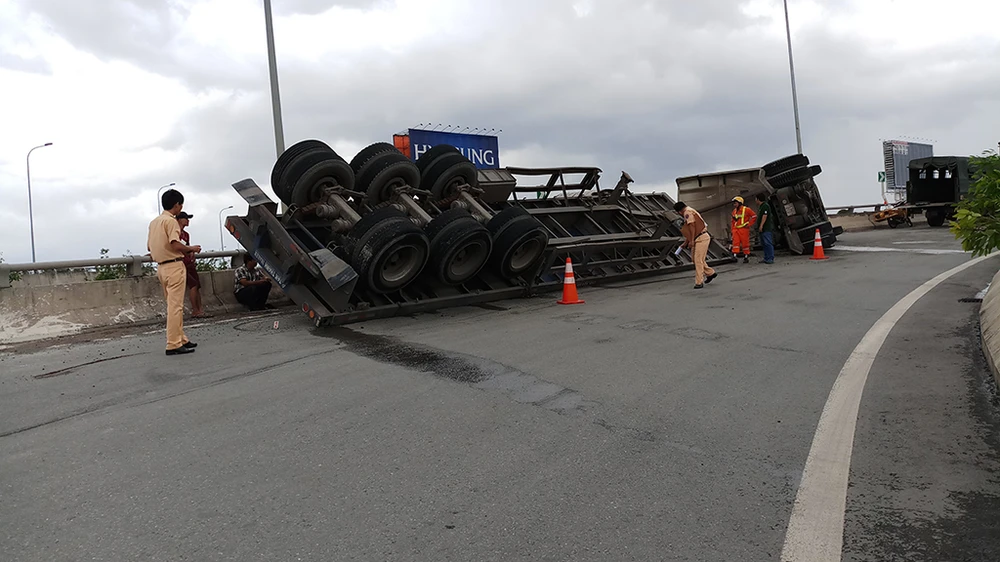 Tại hiện trường, xe đầu kéo lật ngữa, dầu nhớt trong xe chảy tràn lan ra đường. May mắn sự cố không gây thiệt hại về người.