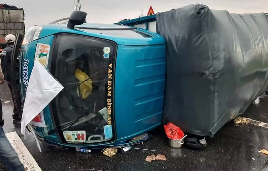 Xe đi cứu trợ người dân bị lũ lụt gặp mưa to, gió lớn bị lật trên trên quốc lộ 1A. Ảnh: DNQ.