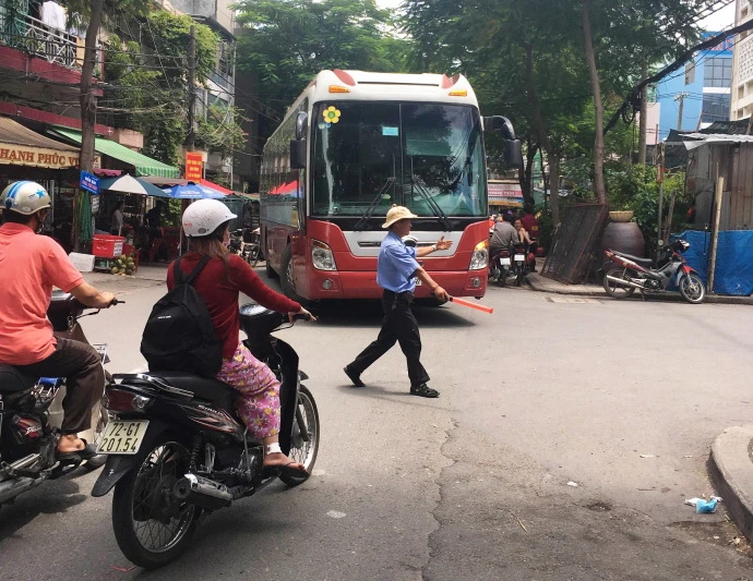Mỗi khi có xe của Công ty Thành Bưởi đi vào địa chỉ số 1, Vĩnh Viễn, phường 2, quận 10, nhân viên của công ty này ra chắn các xe khác để cho xe Thành Bưởi vào khu vực đón trả khách trong khuôn viên Công ty CP Giày Sài Gòn. (Ảnh chụp lúc 11 giờ 5 ngày 1-10-2016)