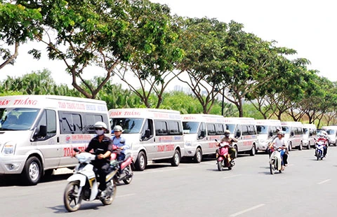 Hãng xe Toàn Thắng đậu hàng dài trước cửa hầm Thủ Thiêm (quận 2) chờ “tài” để vào trung tâm, dừng trước chi nhánh trên đường Nguyễn Thái Bình đón khách. Ảnh: LĐ
