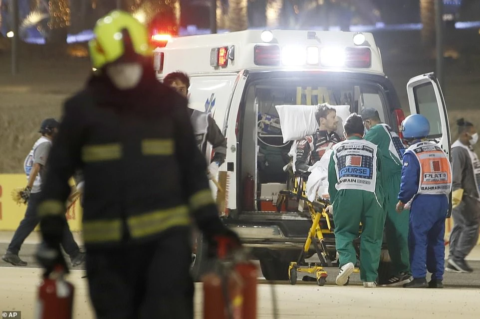 Grosjean được đưa lên xe cứu thương chăm sóc. ẢNH: AP