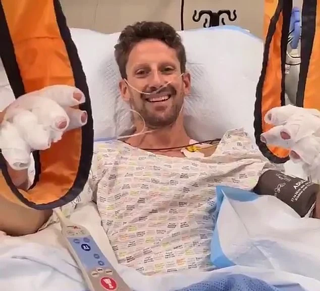Grosjean tươi cười bên giường bệnh.