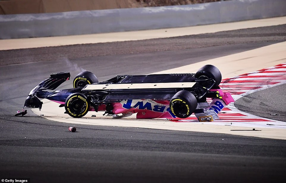Chiếc xe của Lance Stroll bị lộn ngược trên đường đua. ẢNH: GETTY